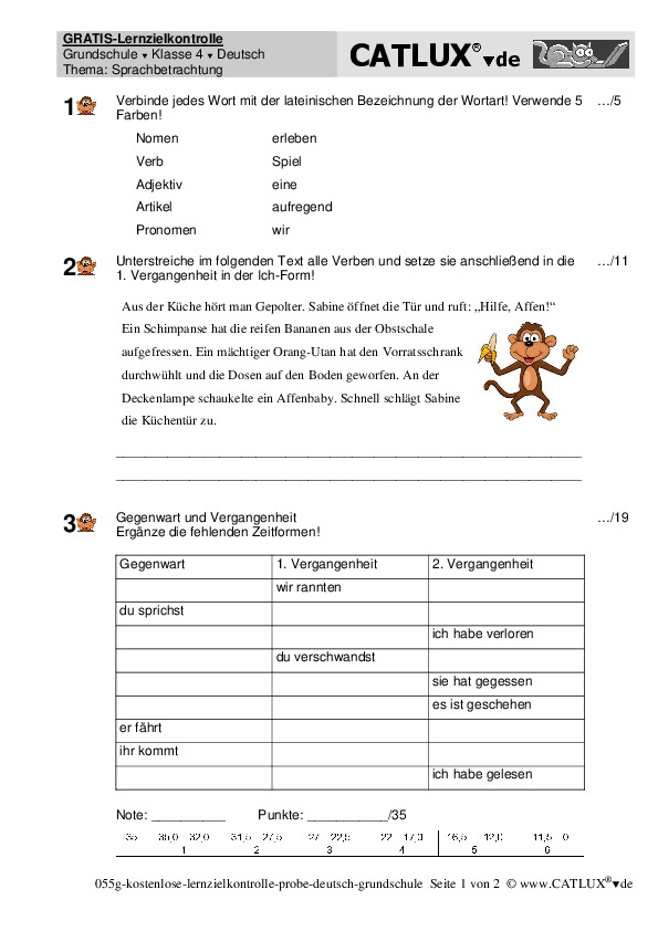 deutsch klasse wortarten proben grundschule sprache lernzielkontrolle catlux untersuchen probe zeiten